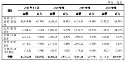 其中,商品化小鼠模型销售业务包括斑点鼠、免疫缺陷小鼠模型、人源化小鼠模型、疾病小鼠模型与基础品系小鼠,为公司主要收入来源。于报告期内分别给公司贡献了3292.62万元、9526.84万元、1.53亿元及1.09亿元的收入,在各期营业收入中占比分别为61.79%、49.88%、58.59%及61.54%。